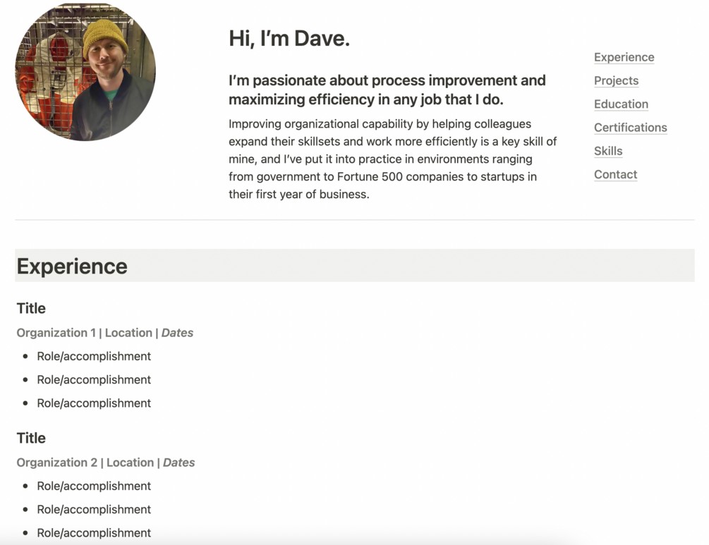 A simple Notion resume template to highlight your experience, projects, and skills.